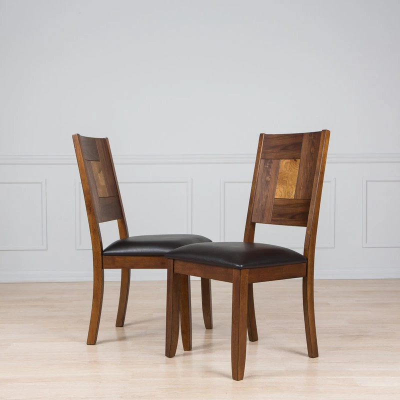 This classic design chair combines both style and comfort. Crafted from sturdy hardwood with a lovely walnut finish, the chair features a square solid back with straight legs and rungs. This casual and modern chair is perfect for entertaining your guests and family at dinner time.