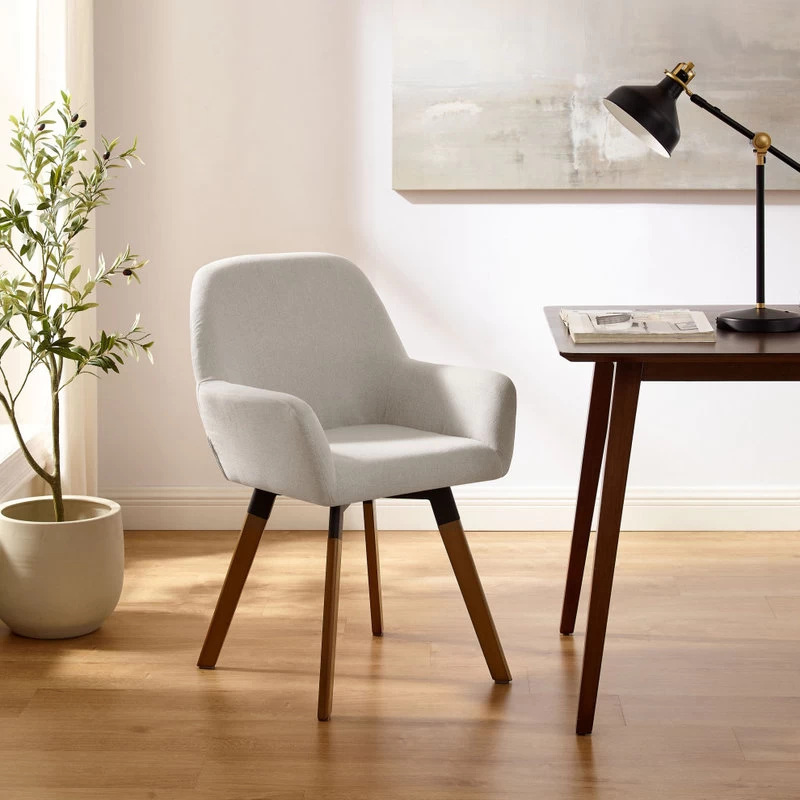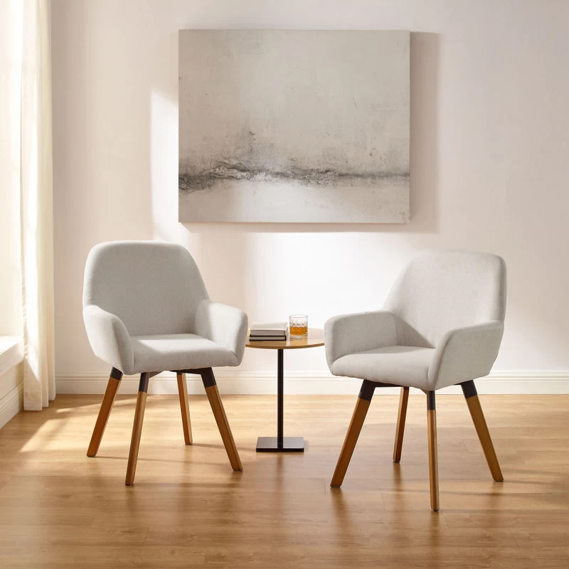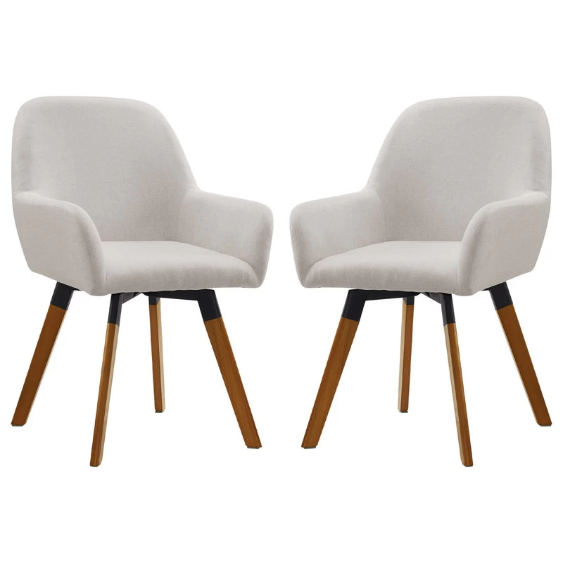 Bring a touch of mid-century modern vibe to your dining room or kitchen with this set of 2 dining chairs. Featuring soft Linen upholstery bucket-shaped seat with high-density foam padding, these kitchen chairs offer you a comfortable seat to relax or lounge. Solid splayed Beech legs with a natural finish add extra durability and sturdiness. The swivel seat can spin 360 degrees ensuring easy mobility. Blend classic elegant clean-lined design and practical function to your living room, dining room, home office, vanity, or bedroom with these armed dining chairs for extra cozy seating.