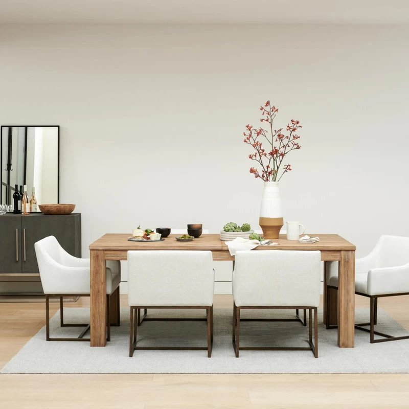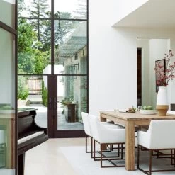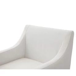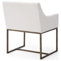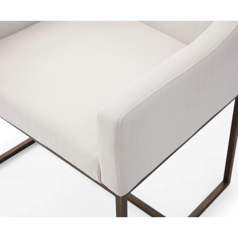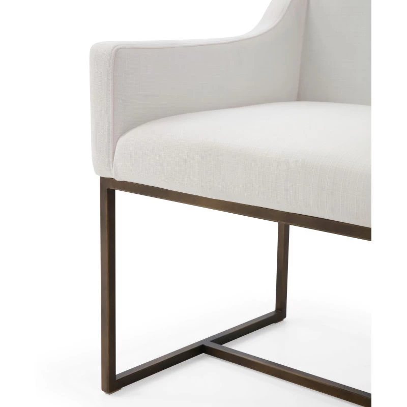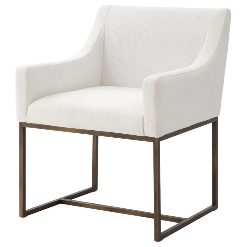 The Elijah Dining Chair is a beautiful modern contemporary piece of furniture. The squared slope arms match height perfectly with the low back of the chair, creating a fully embracing silhouette. Upholstered in a soft off white fabric, this chair is comfortable and stylish. The antique brass finished legs have modern lines and contrast the soft fabric. These versatile chairs can be paired with any style and look right at home.