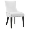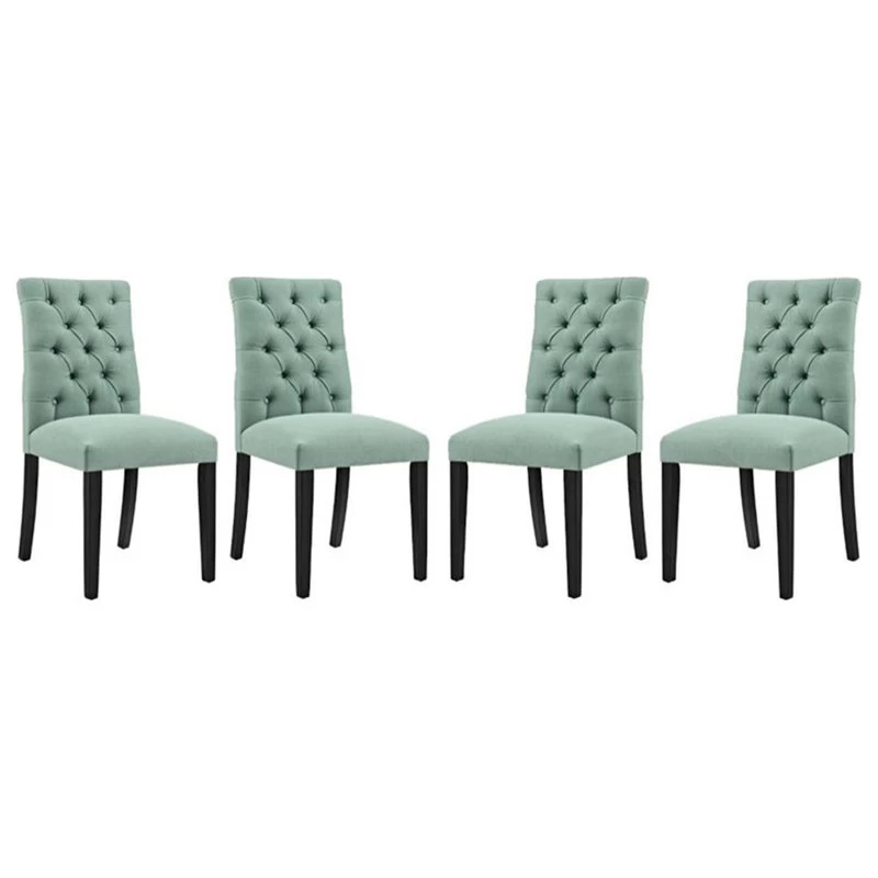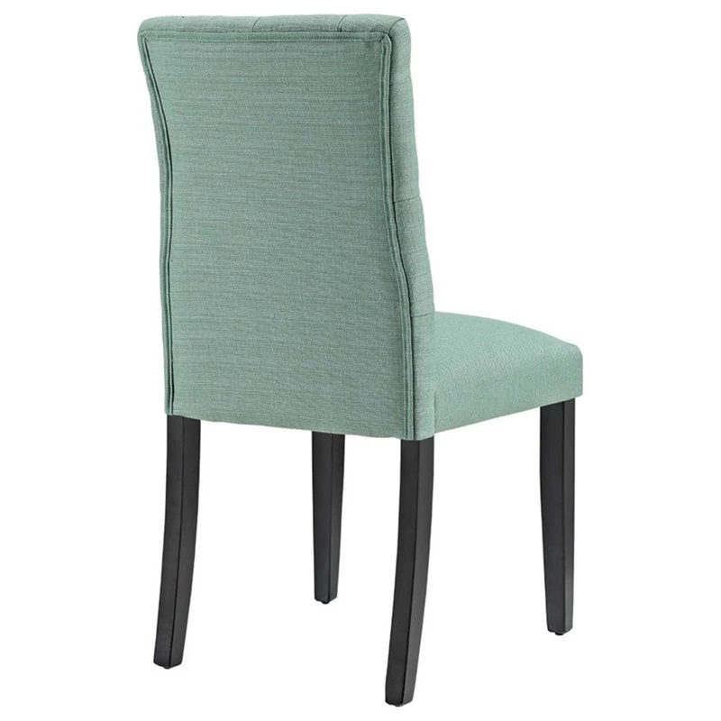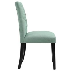Bestow elegance with the Duchess Dining Chair. Chic and luxurious, Duchess features a stylish curvy form, richly tufted button back, dense foam padding, fine fabric upholstery, and wood legs topped with non-marking foot caps. Resonate grace and charm with a dining chair perfect for the modern home.