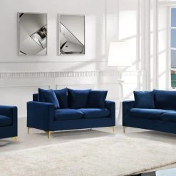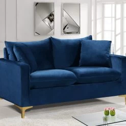 Curl up with a good book from the welcoming confines of this Naomi Navy Velvet Loveseat. The color of this loveseat adds a bold touch to your décor and shakes up otherwise neutral color schemes. Plush velvet material feels cozy and comfortable against your skin, while deep seat cushions provide lots of room for you to stretch your legs. This loveseat comes with both gold and chrome legs, so you can customize its look to meet your décor plans. Pillows are included for added homey warmth and comfort.