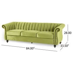 Present your home in modern luxury with a centerpiece sofa that exudes a glamorous vibe at every angle. Our Chesterfield-inspired sofa is the ideal addition to any living room with its classic design and traditional elements such as scrolled arms, turned legs, and nailhead accents. Upgraded with a sleek modern touch of channel tufting, this three-seater sofa brings you an undeniably elegant touch to your interior space. Featuring soft velvet upholstery, this sofa stands as a streamlined statement piece that can change the whole flow of your living room.