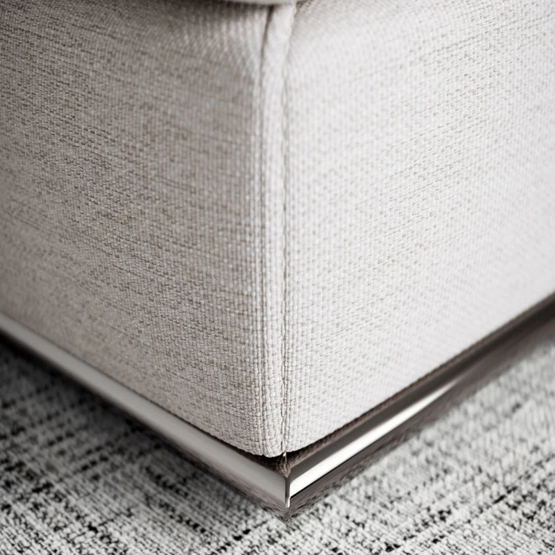 Elegant in its minimalism, unparalleled comfort, and epic scale, the Perry offers modular components creating endless configuration possibilities. Upholstered in a plush, soft-hand, premium basketweave fabric, featuring exceptional durability and resistance to fading. A brilliantly polished chrome steel tube wraps around the base of the module seamlessly, with perfect 45-degree joinery. Smoothly connect multiple components with an included clamp. Solid eucalyptus construction with Pirelli webbing support, plus high resiliency foams (seat, back, and arm) remind us of true artisanal craftsmanship. Includes one armless modular unit and one connection clamp. Throw pillows sold separately. Throw pillows sold separately. Sofa configuration as shown includes one left- or right-facing, two armless, one corner, and one end-of-sectional ottoman unit.