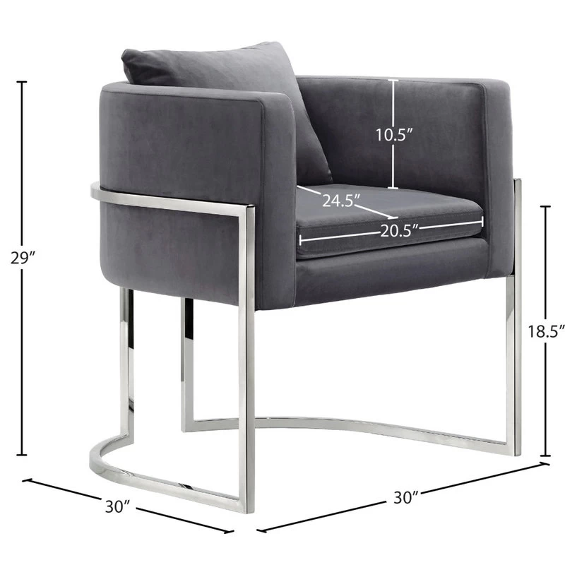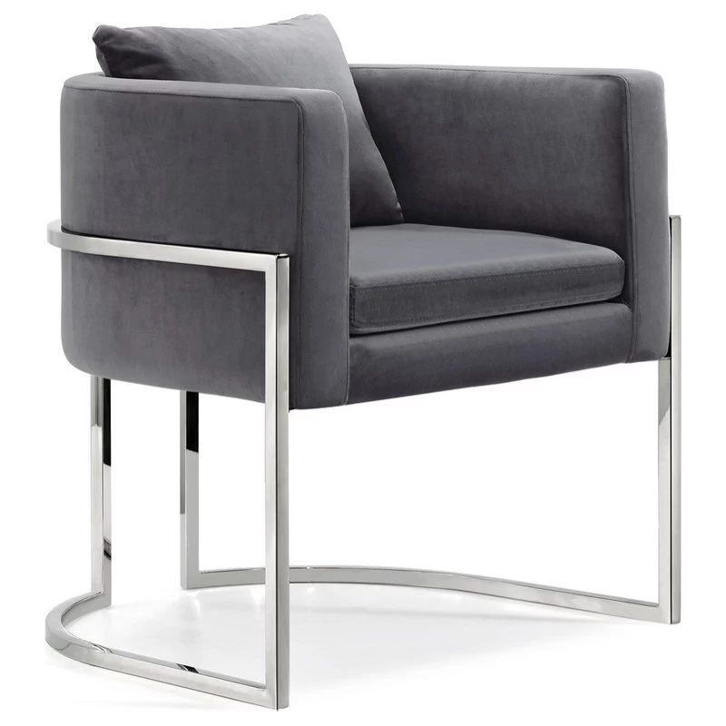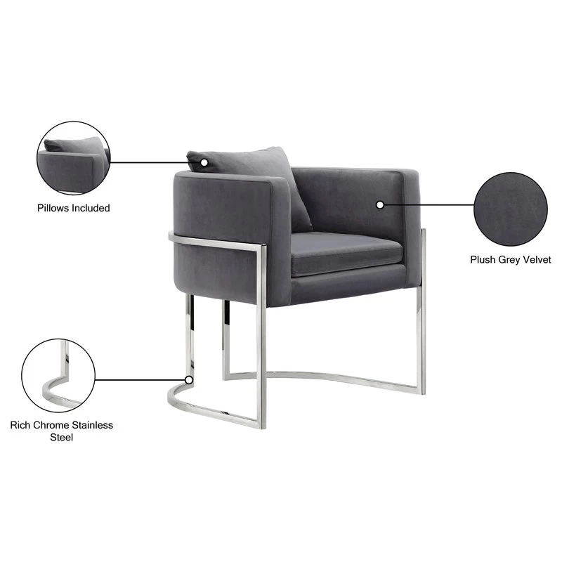 Elegant and eye-catching, the stunning Gray velvet Pippa Accent Chair from Meridian Furniture is the perfect addition to any space.Rich Chrome Stainless Steel Plush Gray Velvet Contemporary DesignLight Assembly: Simply Attach Base