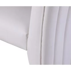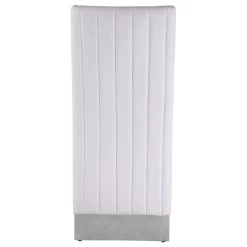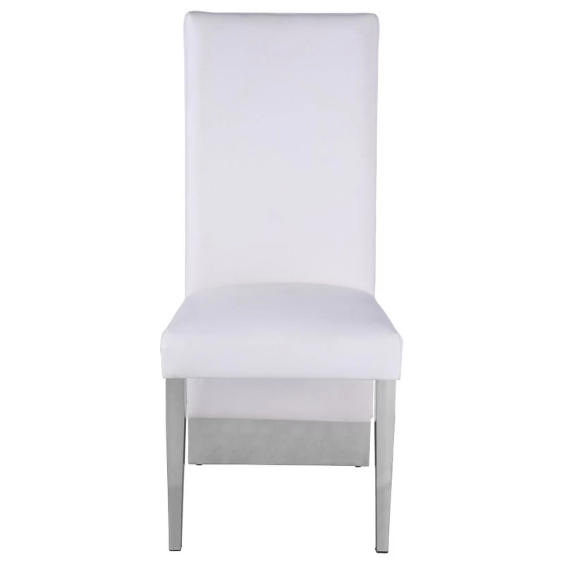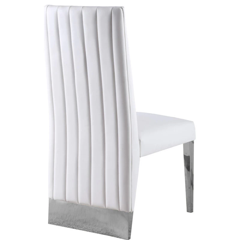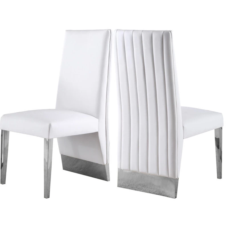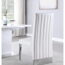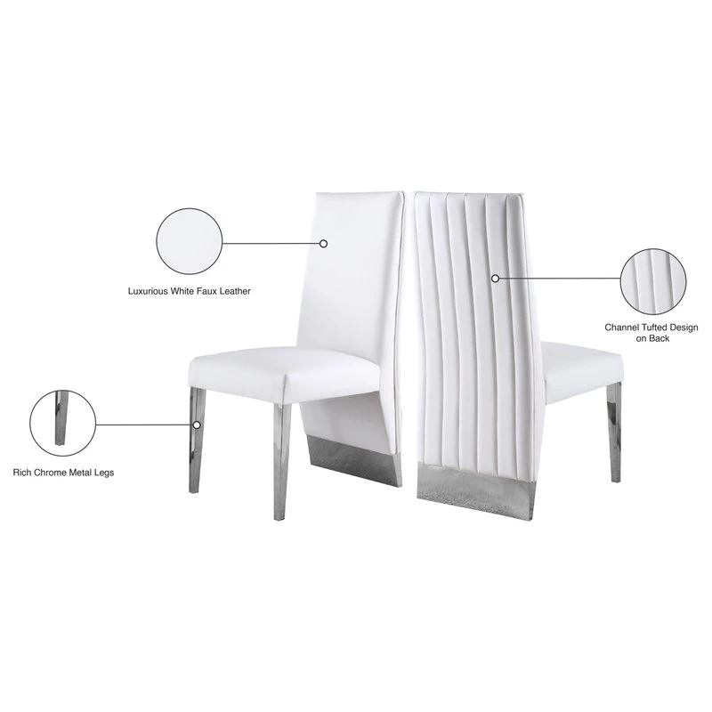 Bring the luxe look of this Porsha chair to your dining space. Impressing guests is simple when they’re seated in this chair. The floor-length back is elegantly beautiful and creates a striking silhouette from every angle. Faux Leather upholstery material in a sophisticated hue of white adds a touch of modernity to this chair, and the reverse is channel tufted for added elegance and refinement. Chrome legs complete the look for added contemporary panache and sturdy support.