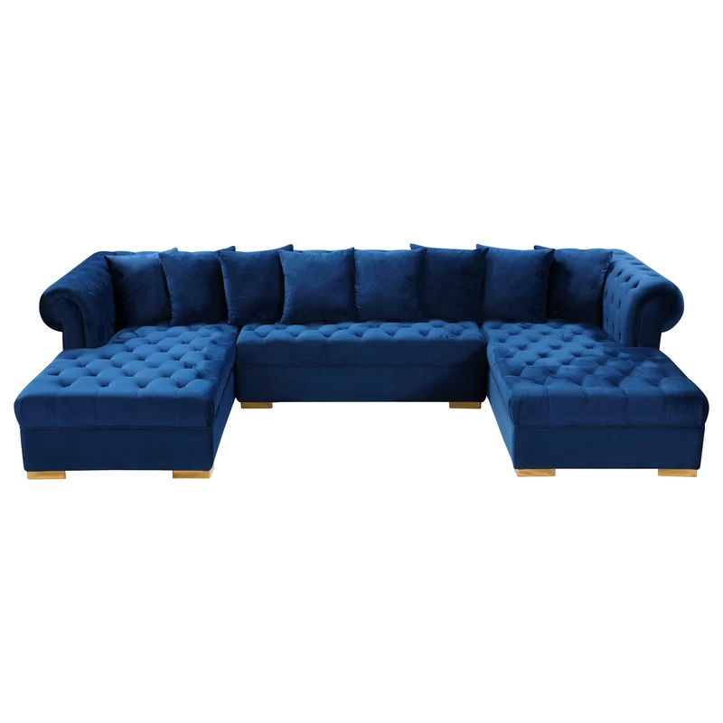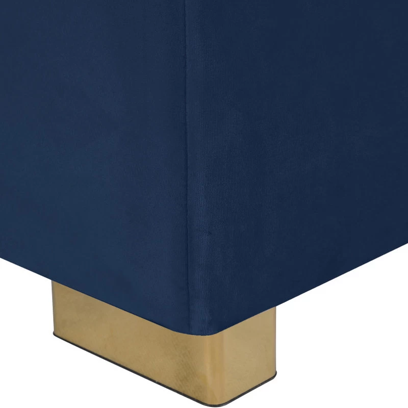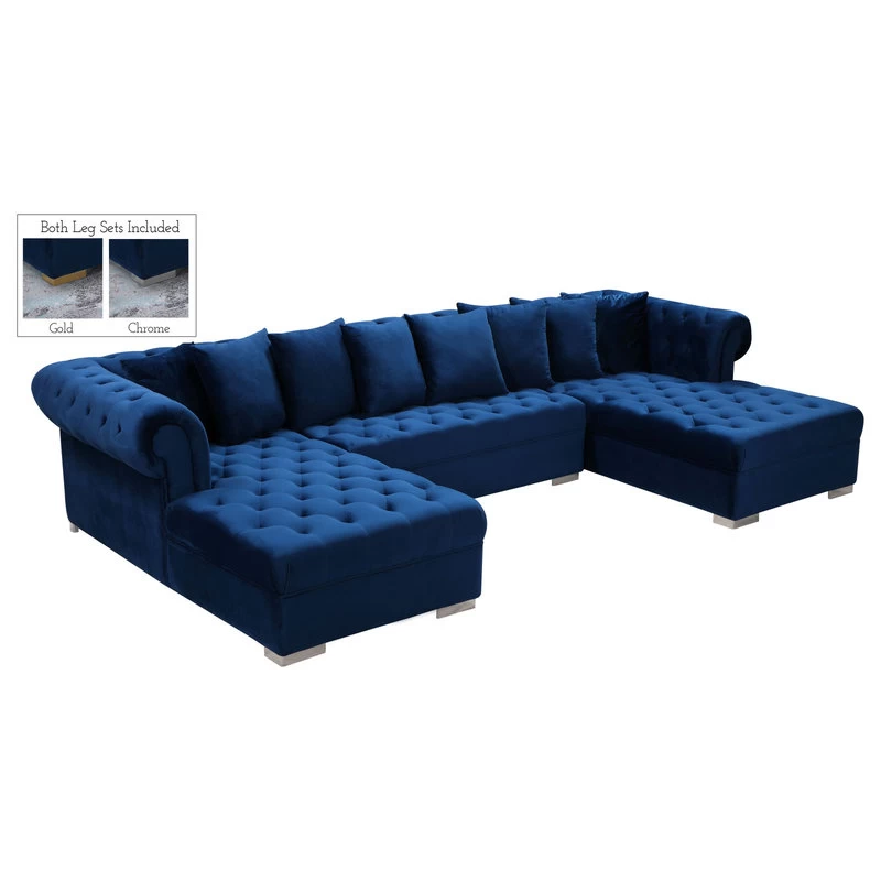 Get ready to relax after a long day with this Presley Navy Velvet 3pc. Sectional from Meridian Furniture. Featuring rich navy velvet upholstery with deep tufting and comfy pillows, this double chaise sectional provides a luxurious, cozy space to kick back and watch TV, take a nap, or curl up with a nice book. Complete sets of gold and chrome legs complement your contemporary home décor while providing solid support for the sectional’s frame.