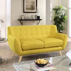Take notice and engage your sensibilities with this plush dual cushion, organically shaped loveseat. Remark is gracefully positioned on solid natural wood dowel legs designed according to mid-century sentiments. Whether settling in with coffee and brunch, or entering a spirited discussion with friends, Remark’s polyester upholstery, two rows of finely stitched back seat buttons, and organic form ensure an eye-catching appeal at every turn. Bring depth and modernity to your contemporary living room or lounge area with the Remark mid-century modern style loveseat.