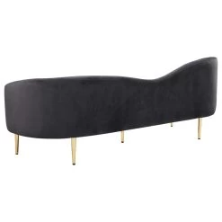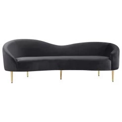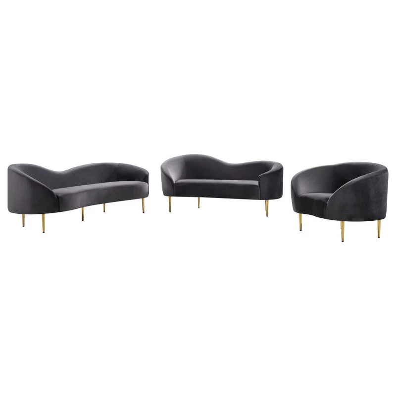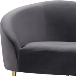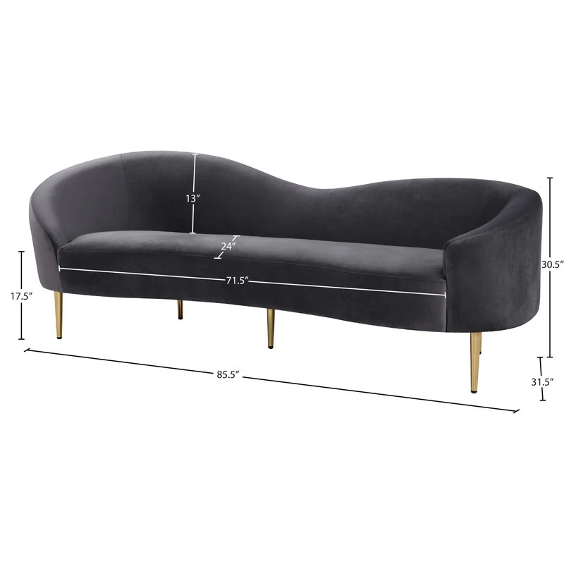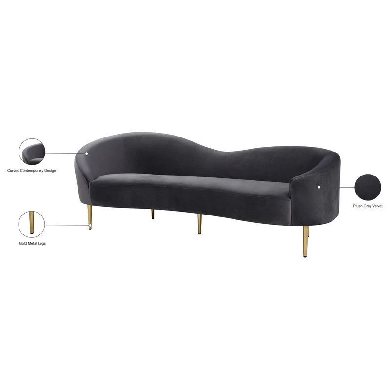 Get comfy while remaining chic in this elegant Ritz grey velvet sofa. Plush grey-colored upholstery provides a soft texture that is pleasing to the senses, while its curved design offers a contemporary touch to your home furnishing. Gold metal legs complement the sofa’s sophisticated grey color, creating a gallant piece anyone would be proud to display in their home.