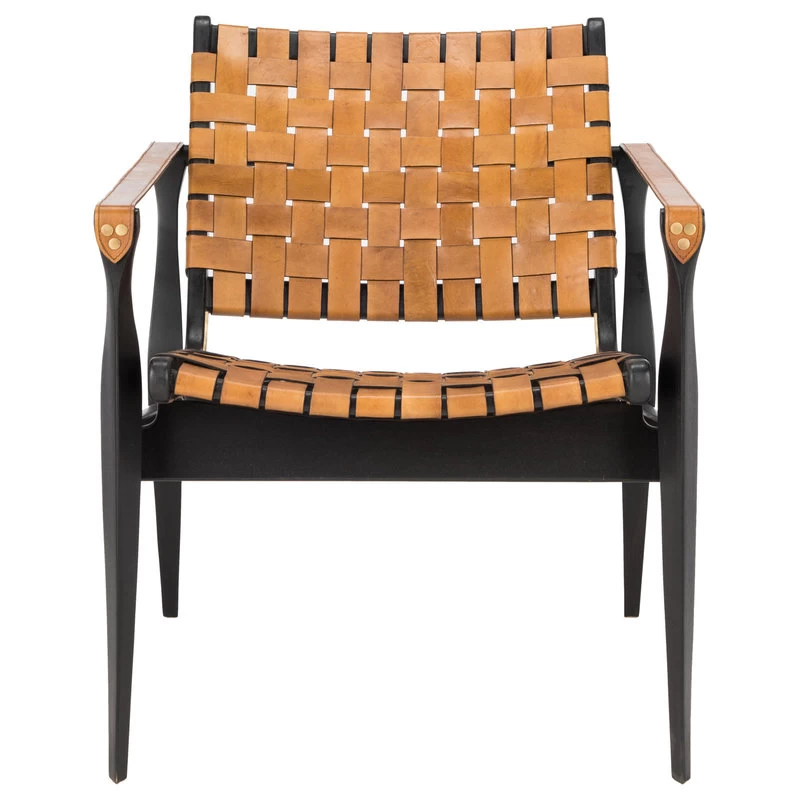 A familiar classic refreshed for the modern aesthetic, the Dilan Safari chair combines brown/black mahogany with upholstery of woven leather straps on its back, seat and arms. Beautifully turned legs and curved seat base recall Mid-century Danish modern style.