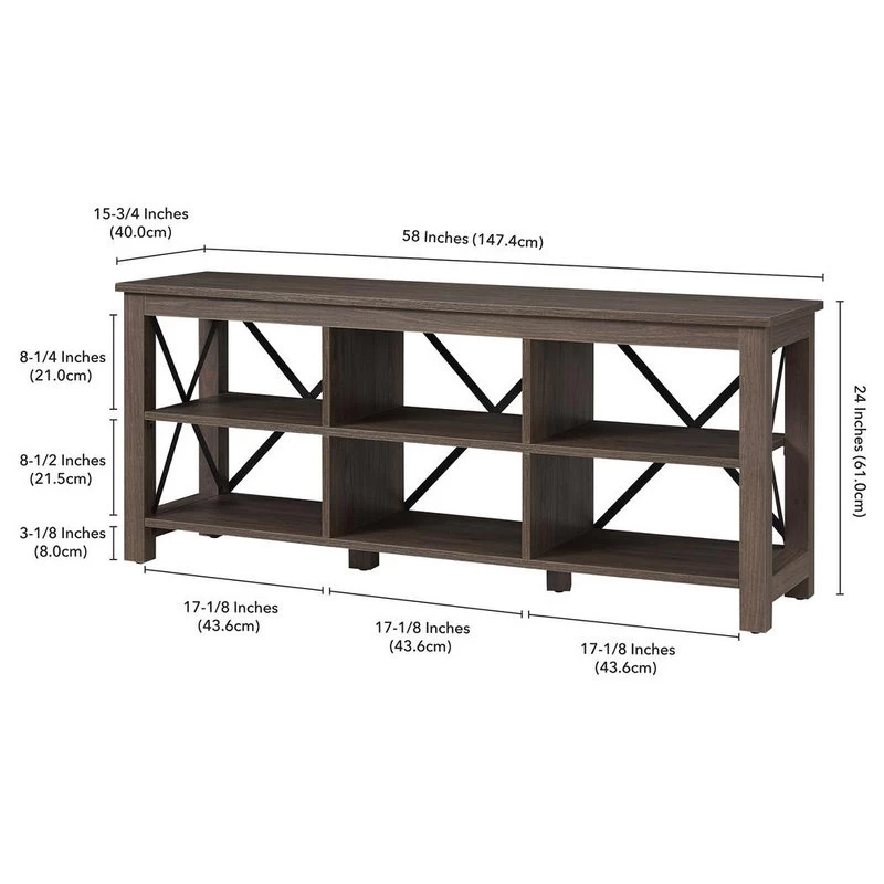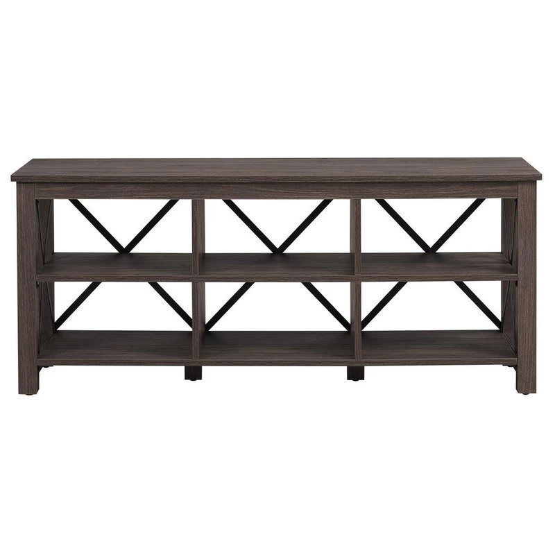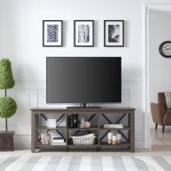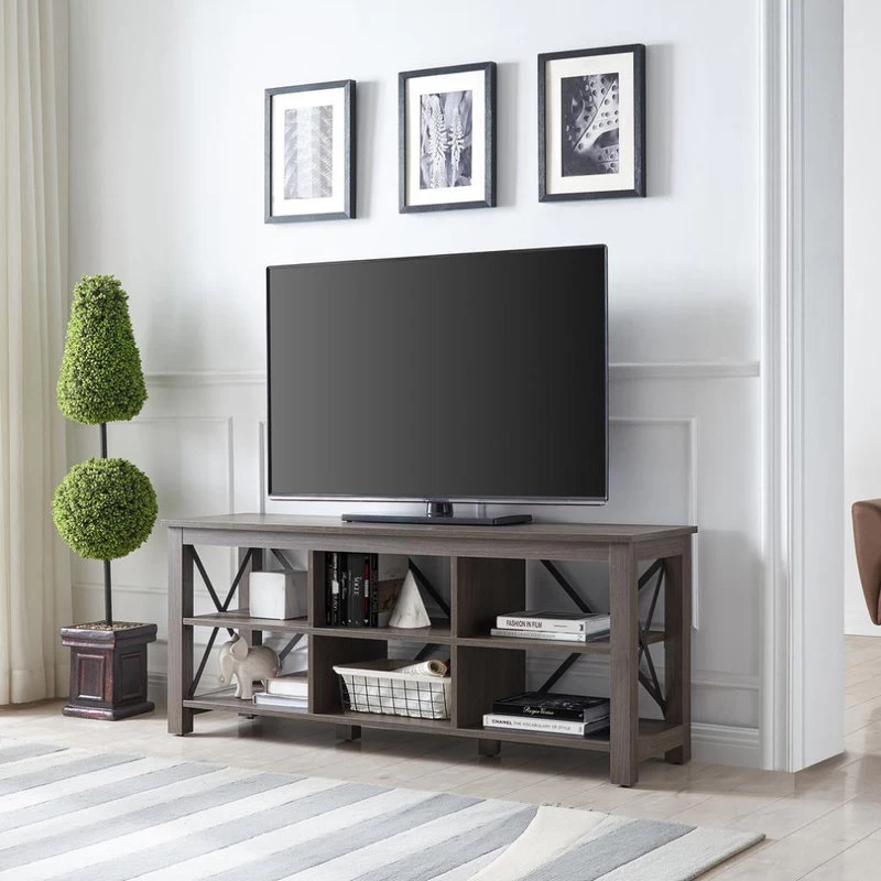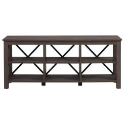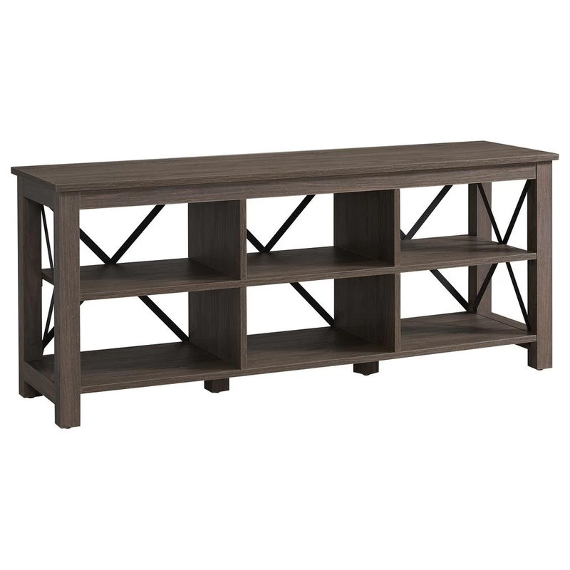 Strong geometric lines set this modern farmhouse-inspired TV stand apart. Its X-shaped black metal accents offset the rich wood tone, creating a warm neutral color palette that will blend seamlessly into any design scheme. A must-have for living areas and entertainment spaces, this TV stand sets the stage for the big game, a movie marathon, or that season finale everyone�s been talking about.