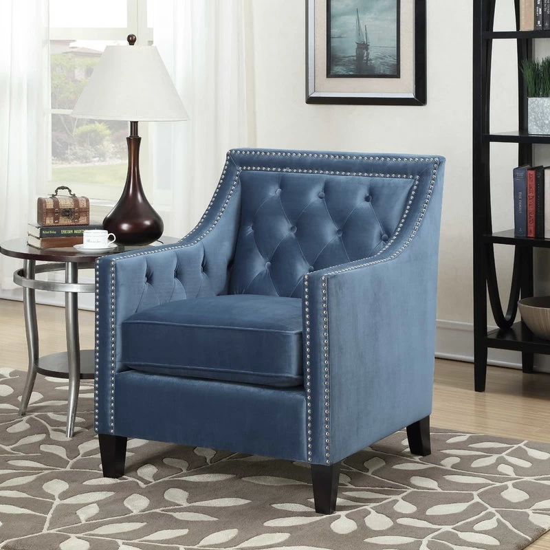 Accentuate your stylish living room design with the Teagan chair. This accent seat is upholstered in smooth velvet-like material and features attractive diamond tufting and decorative nailhead trim. Its clean lines and refined silhouette blend seamlessly with your transitional or contemporary space.
