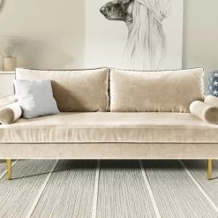 This contemporary sofa features square arms at the right height, a sturdy Eucalyptus wood frame, long-lasting golden metal legs, and is wrapped in incredibly soft velvet upholstery. A high-density foam that provides utmost comfort is stuffed inside the upholstered seats, cushions, and two additional bolsters. This piece is definitely a must-have in your lovely home.