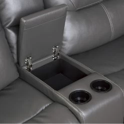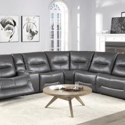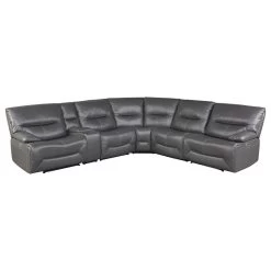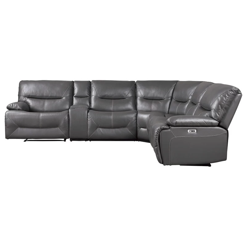 The versatility of the Viggo Collection allows for perfect placement within your space, creating a comfortable spot to unwind. The transitional styling of the sectional features plush pillow-back seating, contoured shape and gray textured faux leather. The right and left side end units feature a USB port and are available as power reclining chair or chaise, each allowing for seated extension. Expanding the length of the sectional are the available console unit – with cup holders and storage space – armless chair and power motion armless chair.