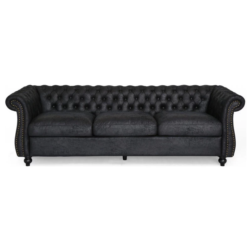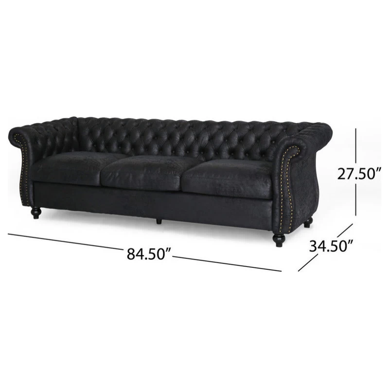 CHESTERFIELD STYLE: Designed with the traditional chesterfield sofa in mind, this sofa hits all the key elements, with deep button tufting, nailhead accents, scrolled arms, and turned legs.