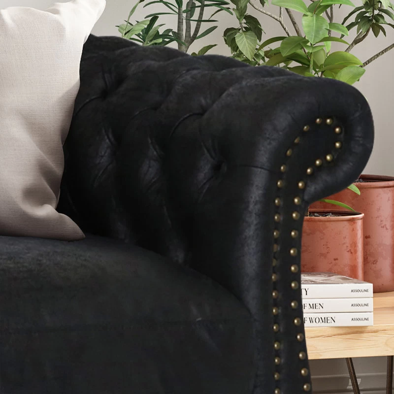 SCROLLED ARMS: To complete the chesterfield look, this sofa features scrolled arms. Not only does it add an air of class to the sofa and your room, but it also provides a more comfortable place to lean against while relaxing on your sofa.