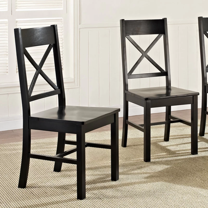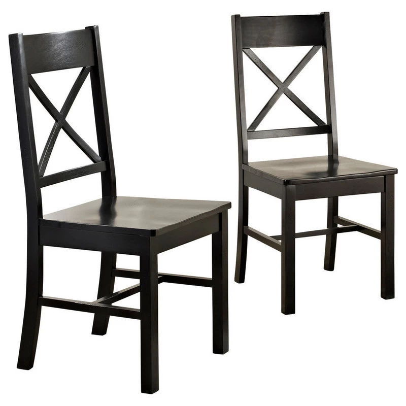 Round out your traditional dining room set with these X-back wood dining chairs. Sturdy and durable these chairs feature man-made distressing and antique finishes on several of the color variations, that add a sense of history, tradition and memory. These classic chairs keep comfort in mind by including contoured seats. H-stretchers provide extra support while also creating a place you can rest your feet on amidst your family meals or friendly conversations. Set includes two chairs.