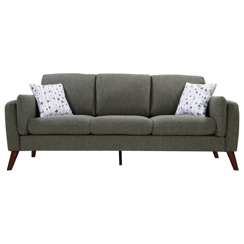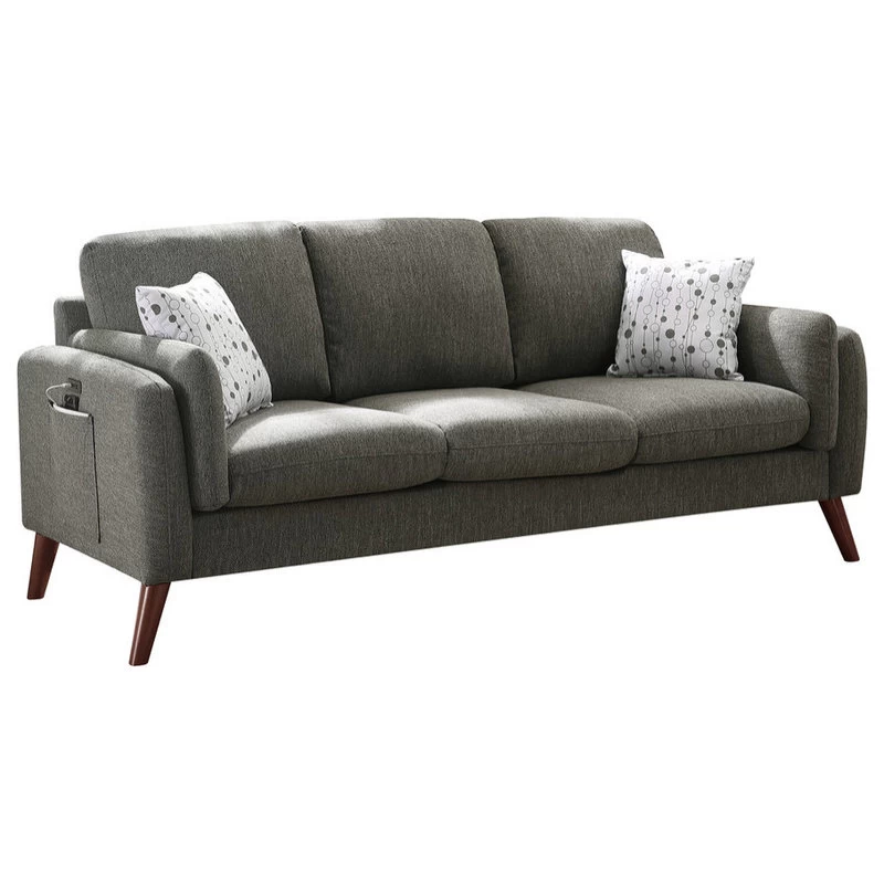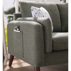 Winston Gray Linen Sofa Couch with USB Charger and Tablet PocketComfort, Style, and Quality! These are the words that define the Winston Collection. This mid-century modern sofa comes with 2 pillows, USB charging ports, and magazine/tablet storage pouch. The square arms and round tapered solid wood legs offers the trendiest look for your home. Perfect for any living room, this beautiful couch will allow you to impress and entertain your guests!